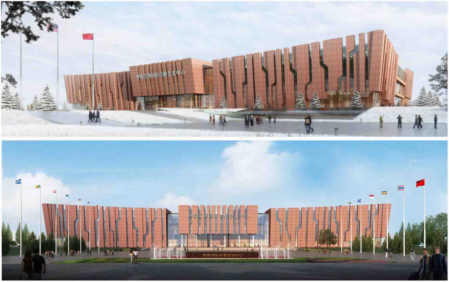會展中心可概括為三個部分構(gòu)成,主展廳區(qū)域,會議劇場區(qū)域,辦公配套區(qū)域。主展廳區(qū)域包括前廳,兩個主展廳,一個專項展廳,其中專項展廳為兩層。會議部分包括一個600人的劇場及若干個中小型會議室、報告廳。在建筑的基座層設有一個300人的學術(shù)報告廳。辦公配套區(qū)域的基座層設有商業(yè)、設備用房、內(nèi)部食堂等,首層為商業(yè),二層為會議配套的餐飲區(qū),三層、四層為內(nèi)部辦公用房。